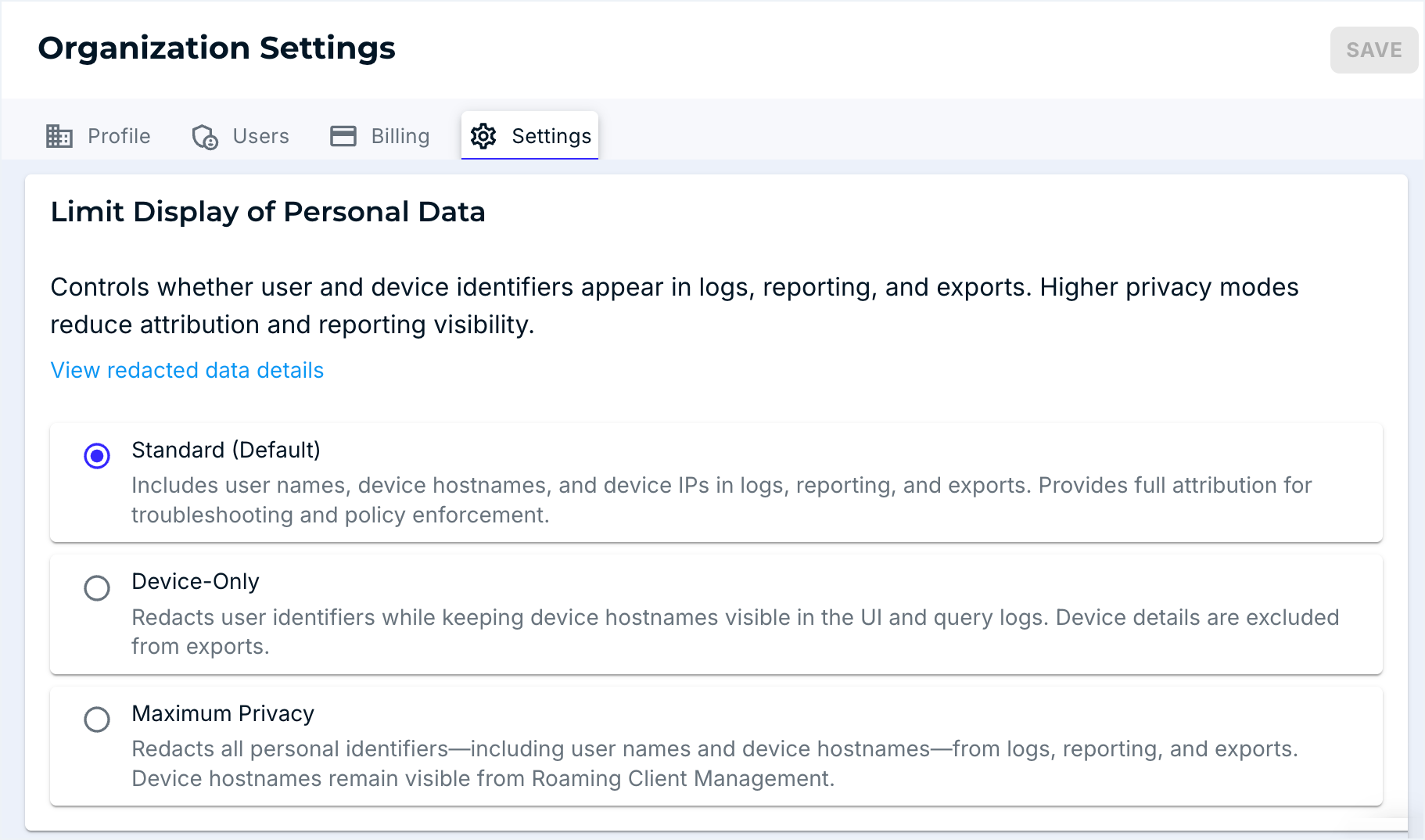 The Limit Display of Personal Data setting reduces the visibility of personally identifiable information (PII) across the DNSFilter dashboard, logs, reports, and exports. Enabling stricter privacy modes limits user and device details and may disable the collection of certain Roaming Client fields.
