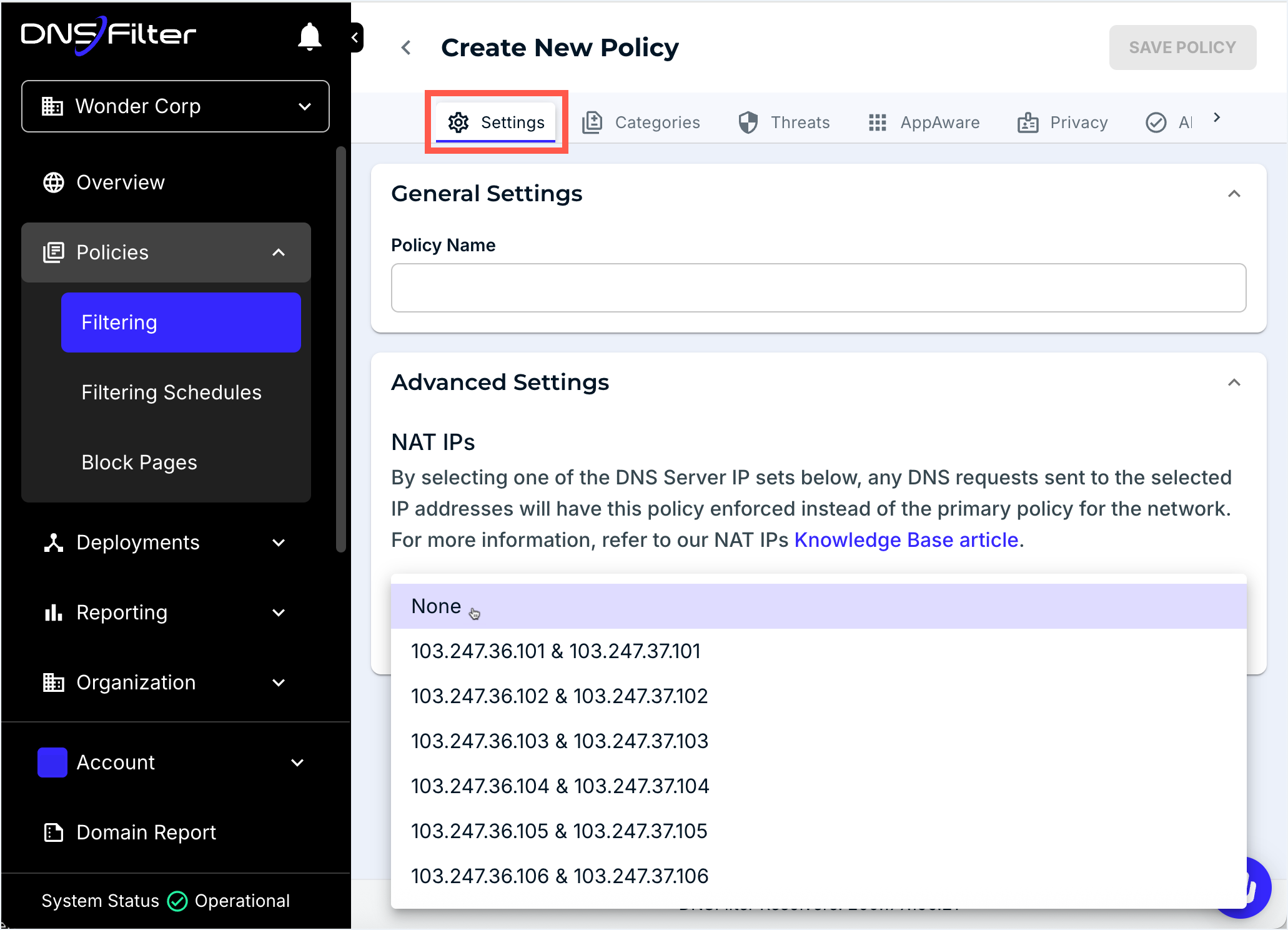 DNSFilter’s NAT IPs feature allows up to 7 different policies using a single egress IP address. This facilitates separate content filtering and/or threat protection policies for different segments of your network, such as guest Wi-Fi, server farms, staff BYOD, and executive devices.