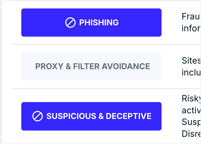 | Suspicious & Deceptive | Risky websites suspected of association with scams, risky software and/or unwanted activity. This category includes, but is not limited to: Host Abuse, URL Shorteners, Suspicious Trackers, Suspected Typosquatting, Potentially Unwanted Applications, Disreputable Businesses, and Fast Scam Stores. |