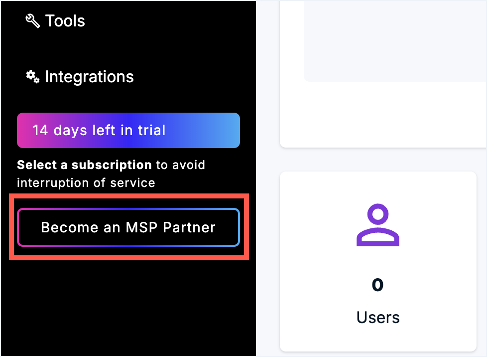 - Select Become an MSP Partner from the lower left corner on the app