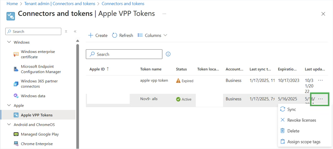 - Select Apple VPP Tokens, locate the VPP token, and select the … button