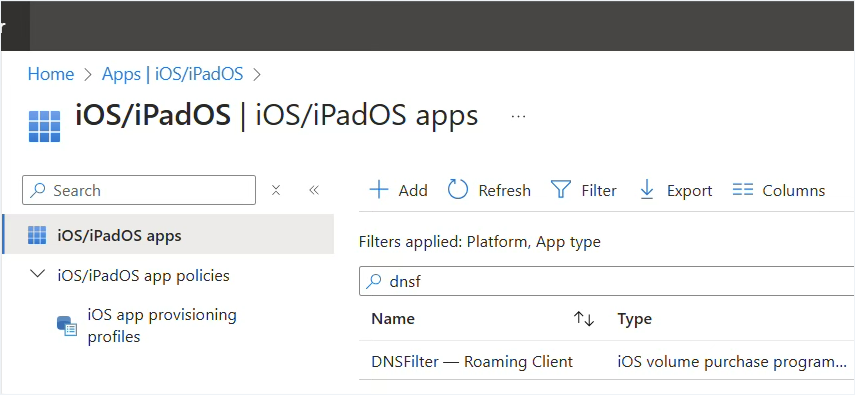 - Locate the DNSFilter app under Home > Apps > Monitor > By Platform > iOS/iPadOS Apps and confirm it appears before proceeding
