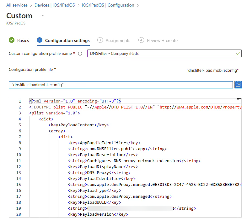 The following deployment example was contributed by a DNSFilter customer. These steps are specific to adding the iOS Roaming Client from the Apple Business Manager (ABM) Volume Purchase Program (VPP) store and deploying via Intune.